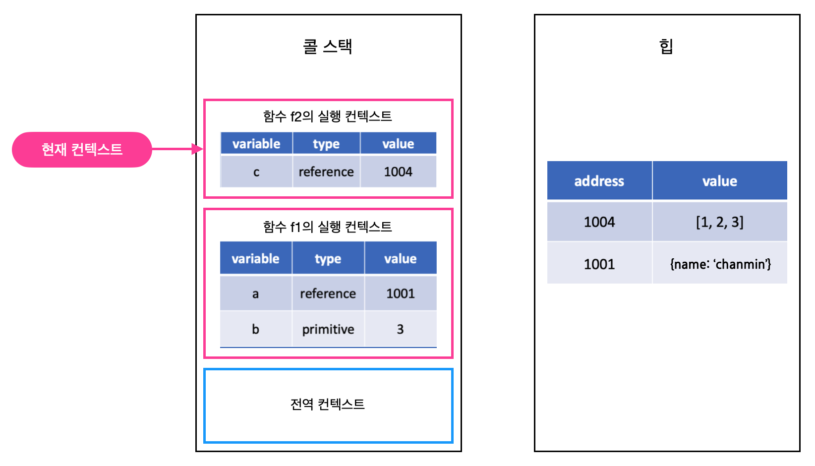 fn2()함수의 동작이 끝나면 fn2() 함수의 실행 컨텍스트는 사라지고, 1004번 주소에 할당되었던 [1,2,3] 는 가비지 데이터로 분류되어 메모리에서 해제됩니다.
