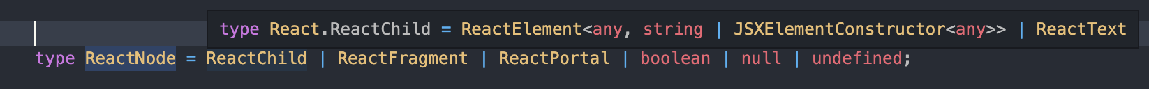 또한 ReactNode 와는 달리 원시 타입을 허용하지 않고 완성된 jsx 요소만을 허용하는데요, 즉 위 사진에서 확인할 수 있는 것처럼 ReactNode 타입이 ReactElement 타입을 포함하고 있는 관계임을 확인할 수 있습니다.