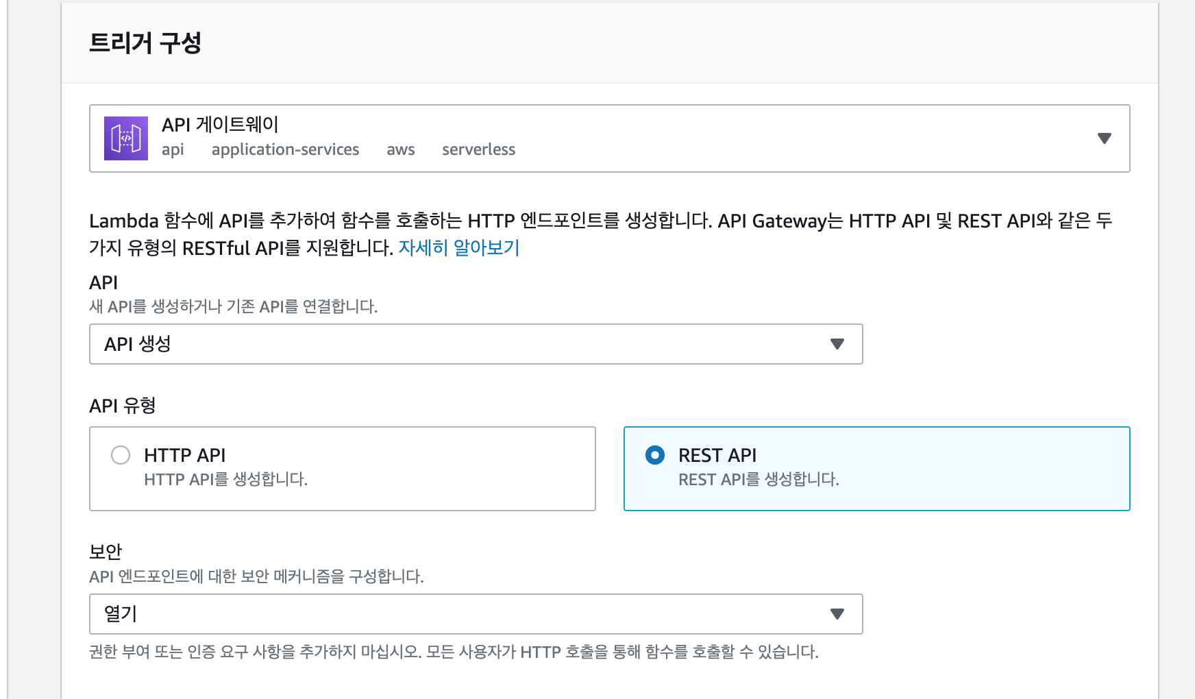 서버리스로 백엔드를 구성하기 위해 API 유형을 REST API로 설정하고, 보안 유형은 [열기] 를 선택한다.