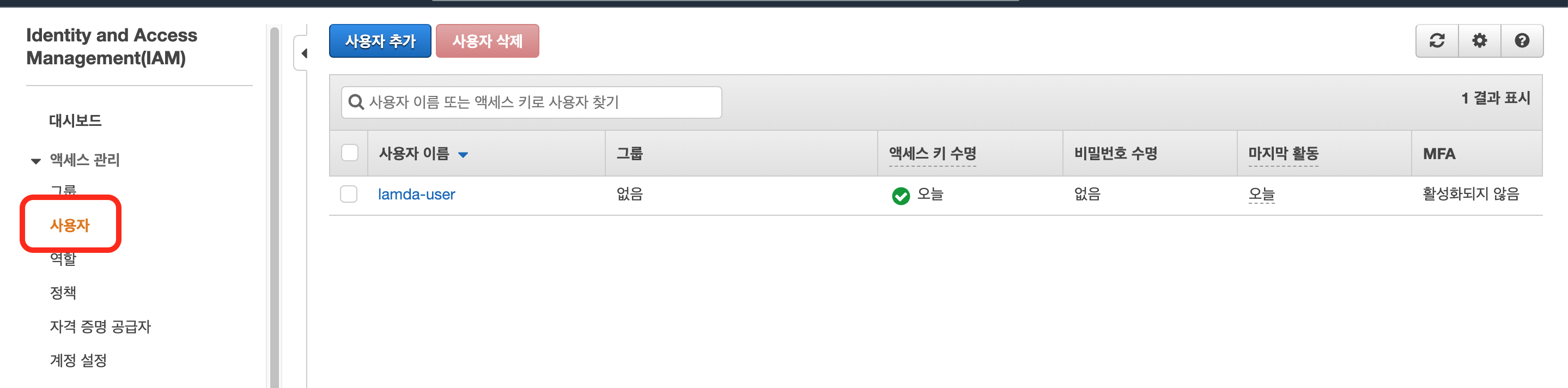 aws-cli와의 연동을 위해 IAM 대시보드 좌측의 [사용자] 메뉴에서 새로운 사용자를 추가한다.