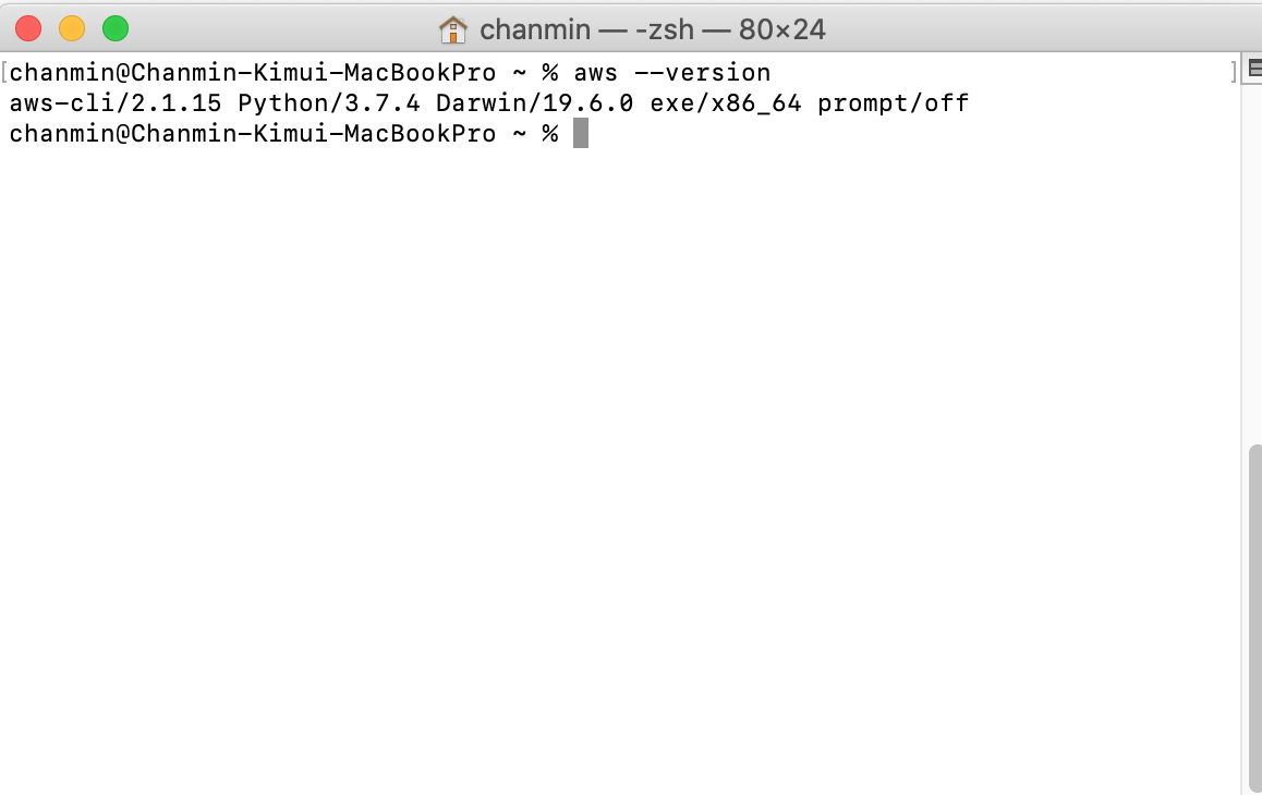 aws-cli 설치가 끝나면 터미널에서 aws --version 커맨드를 통해 설치가 완료되었는지 확인한다.