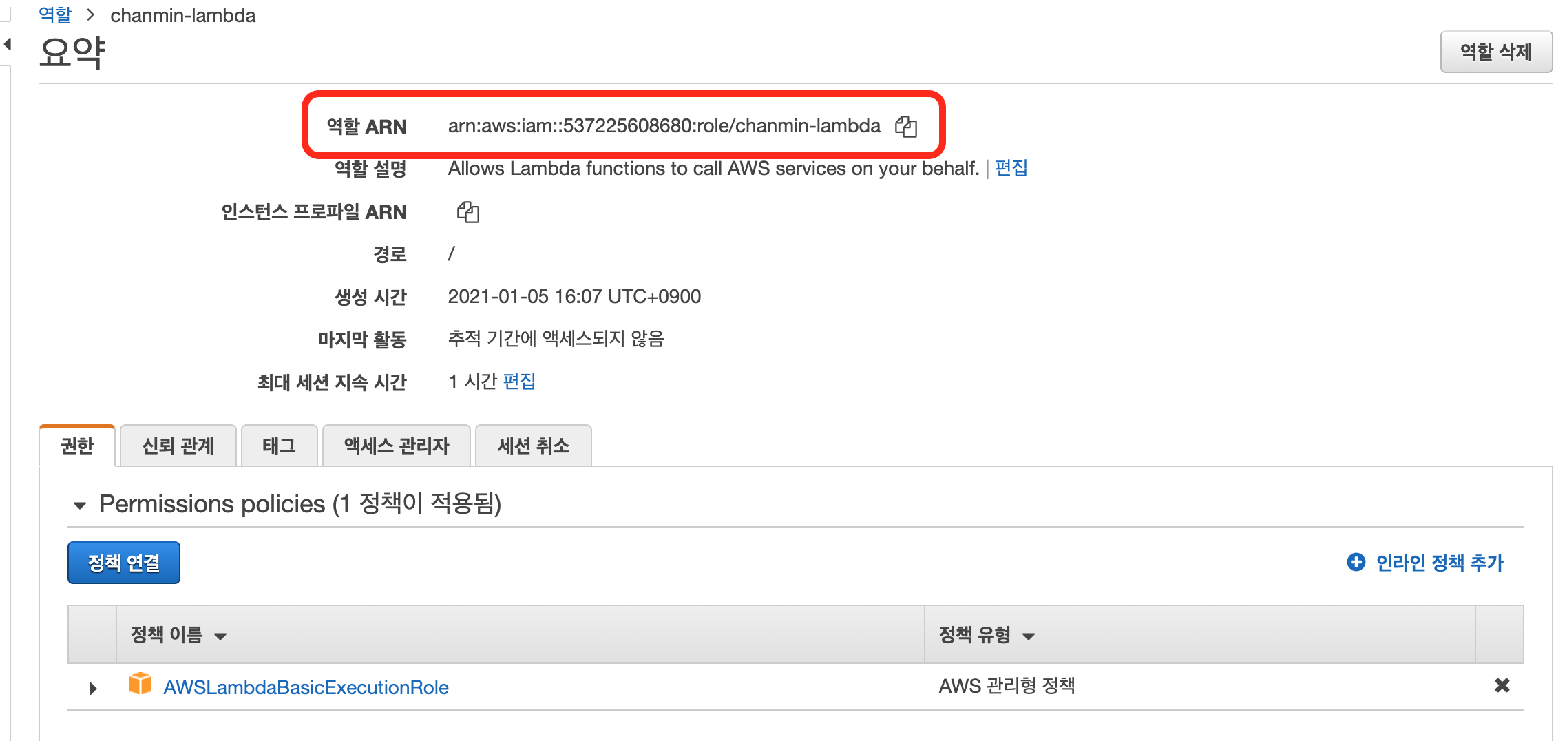 역할이 생성되었다면 생성한 역할을 선택해 역할 ARN을 복사해 두자. (내 코드를 업로드할때 필요하다.)