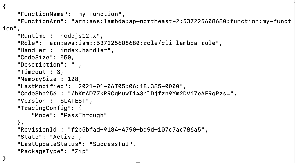 성공했다면 이렇게 코드 정보가 JSON으로 출력된다. (여기서 권한 오류가 출력된다면 역할 권한을 AWSLambdaFullAccess 로 바꿔준다.)