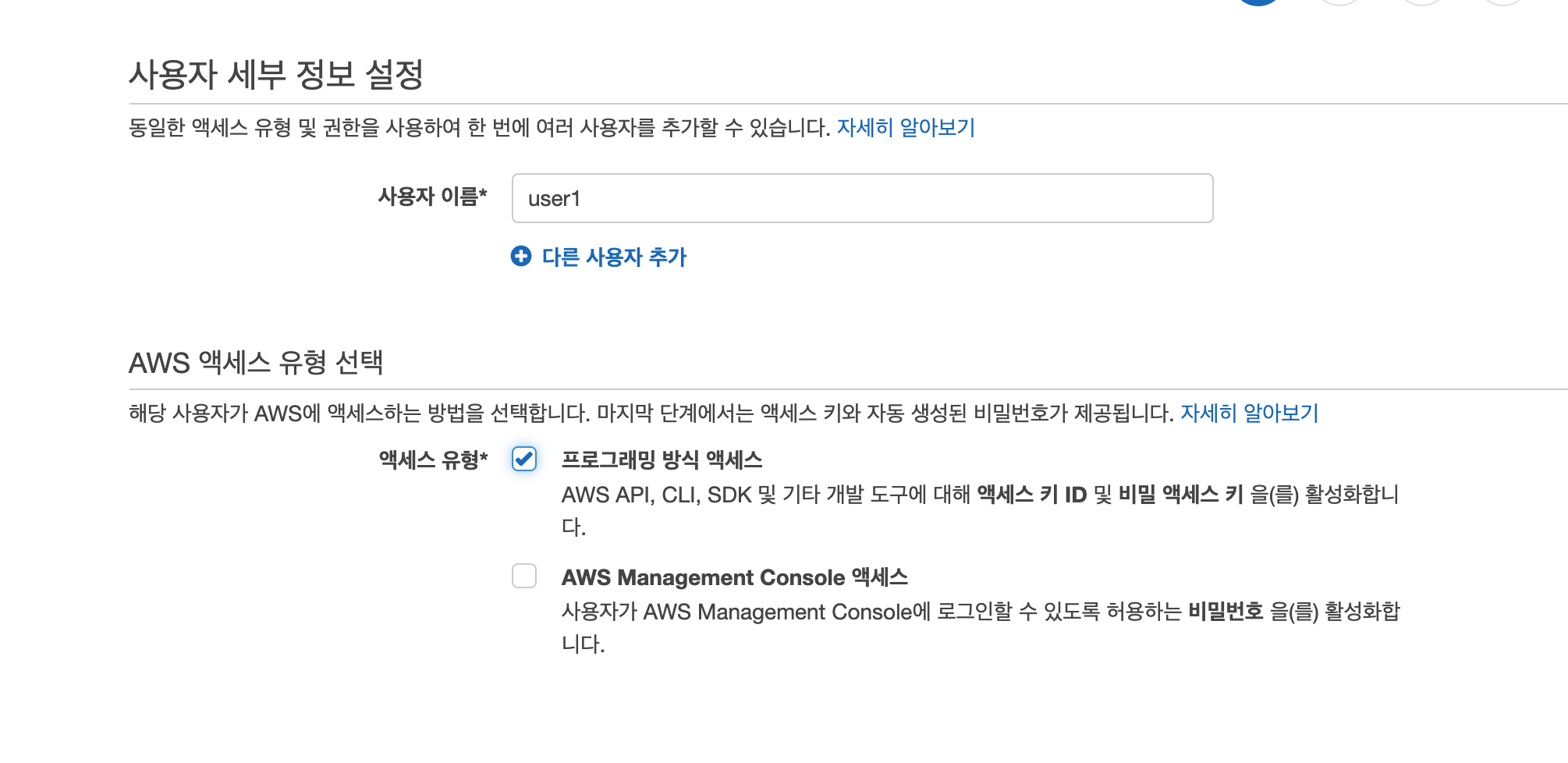 액세스 유형은 cli에 최적화된 [프로그래밍 방식 엑세스]를 선택한다.