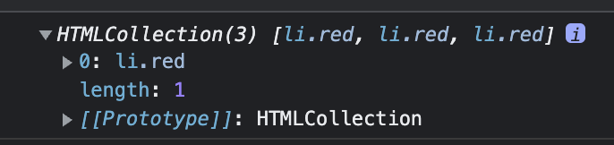 document.getElementsByClassName 함수를 통해 class="red" 속성을 갖는 요소들을 획득한 모습인데요, 자세히 보면 이 컬렉션은 일반적인 배열이 아닌 HTMLCollection 이라는 프로토타입을 기반으로 구현되었다는 것을 알 수 있습니다.