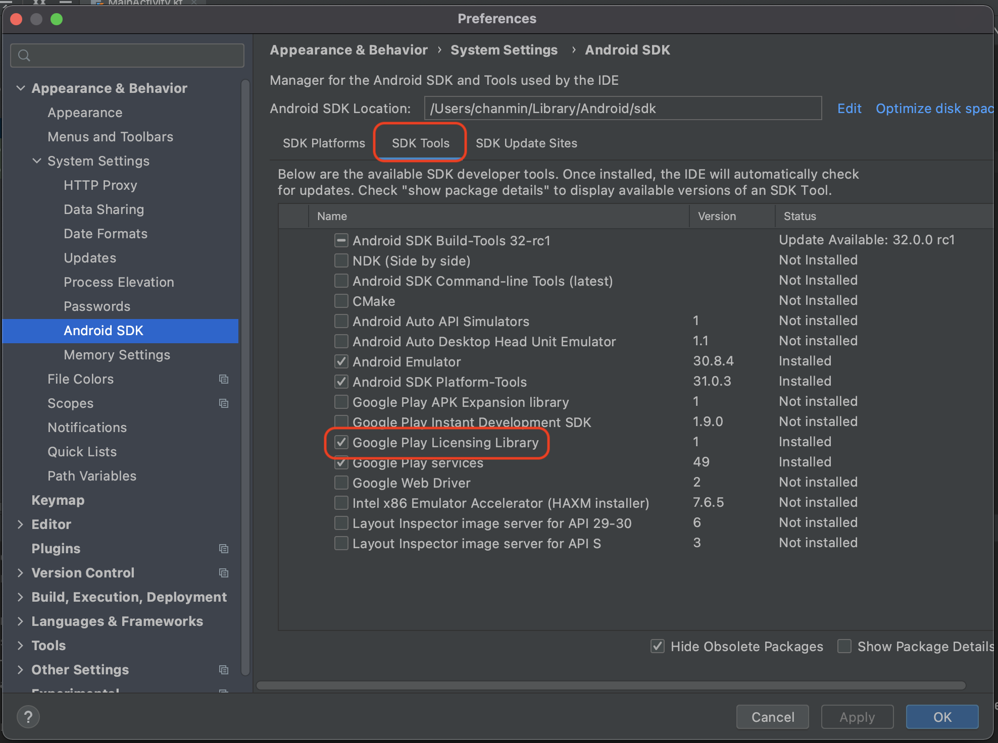 3. SDK Tools 선택 - 메뉴 중에서 Google Play Licensing Library 설치
