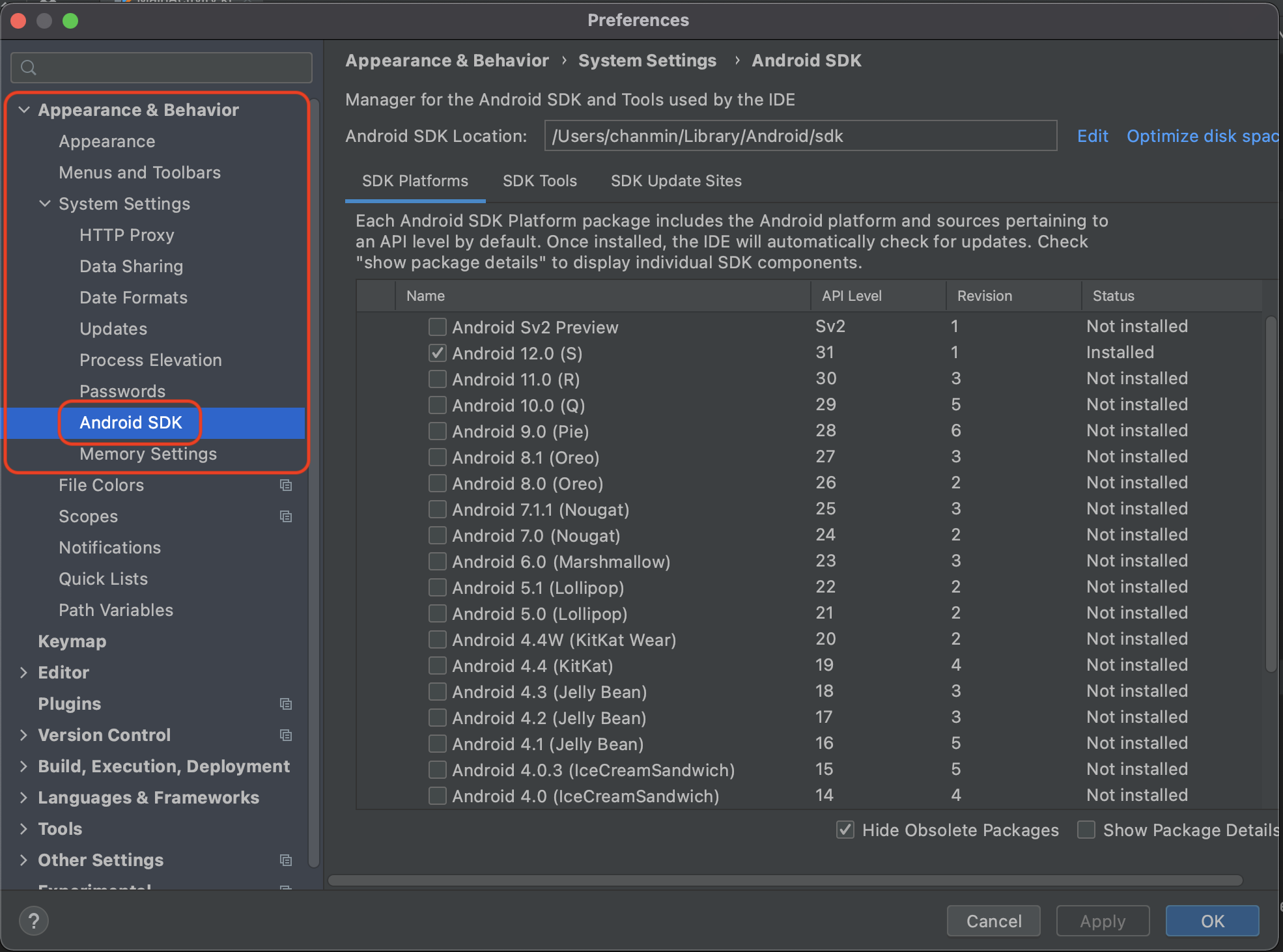 2. Appearance & Behavior - System Settings - Android SDK 메뉴 진입