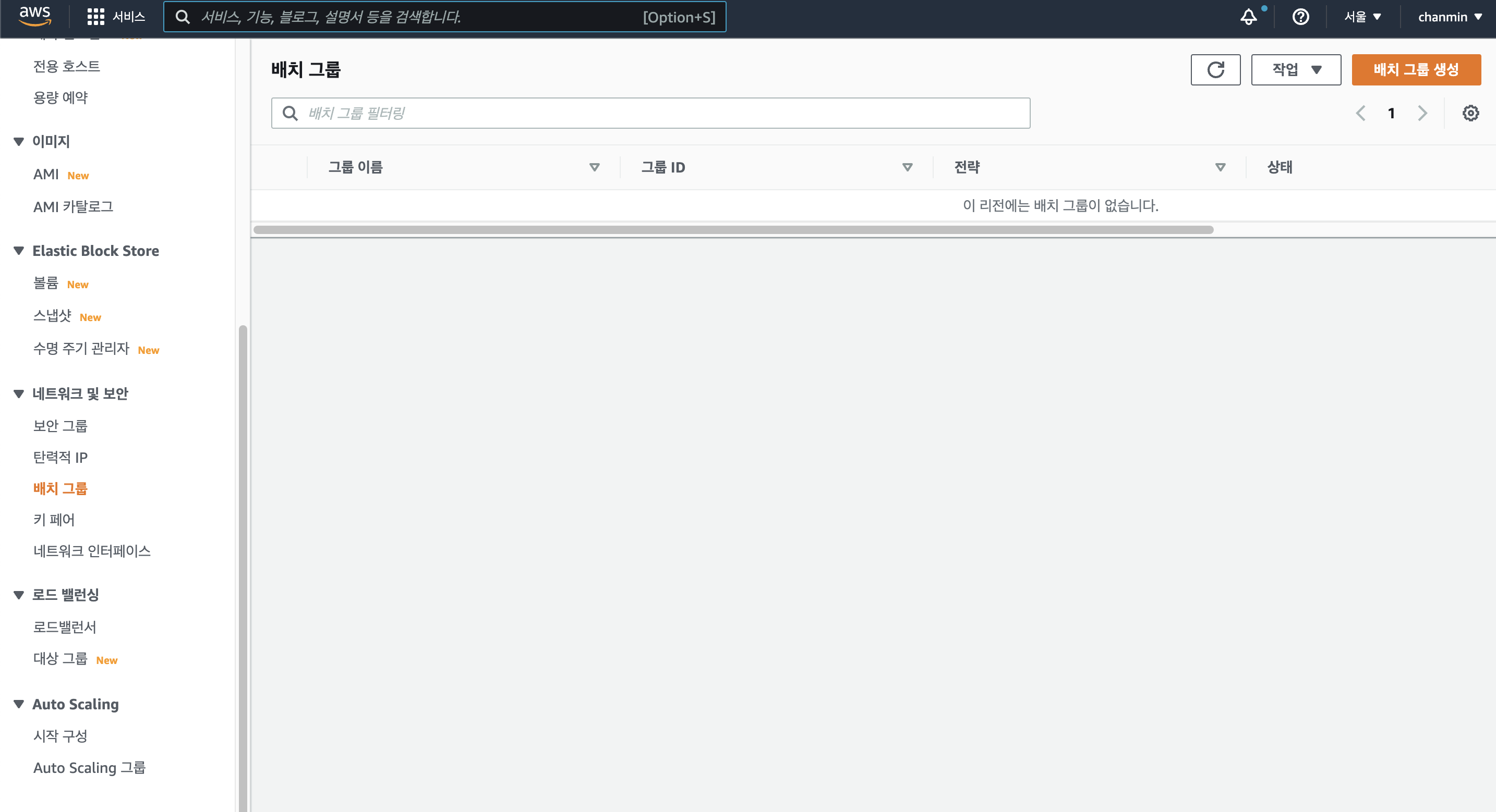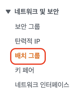 배치 그룹은 EC2 관리 콘솔 사이드바 중 [네트워크 및 보안] 탭에서 생성할 수 있습니다.
