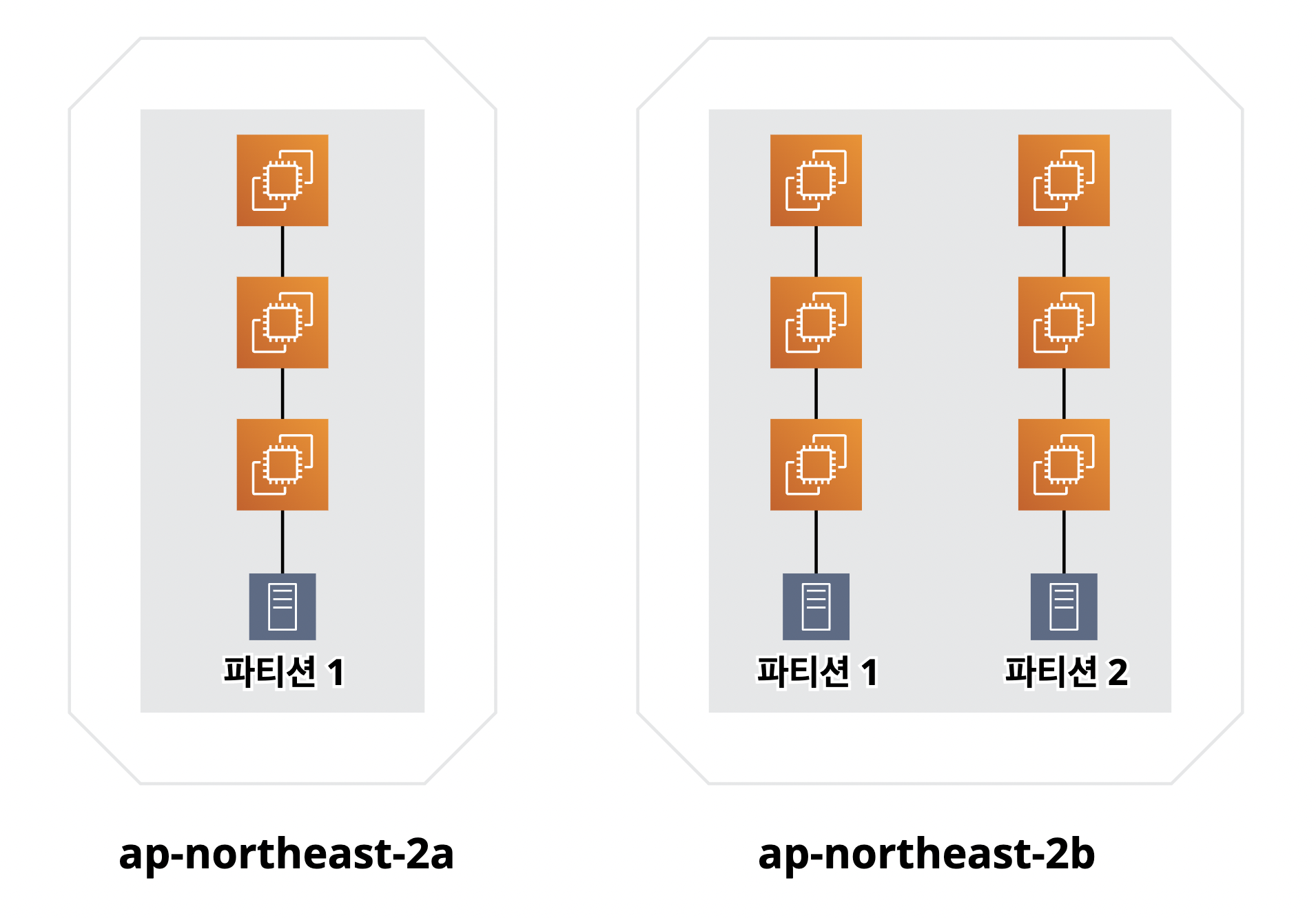 파티션에 장애가 생겨도 다른 파티션에서 작업을 계속 수행할 수 있고, 한 AZ에 문제가 생겨도 다른 AZ의 파티션에서 작업을 계속 수행할 수 있다는 점에서 장애 대응이 쉽게 가능하다는 장점이 있습니다.