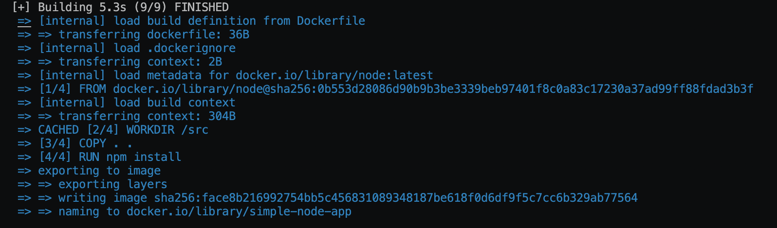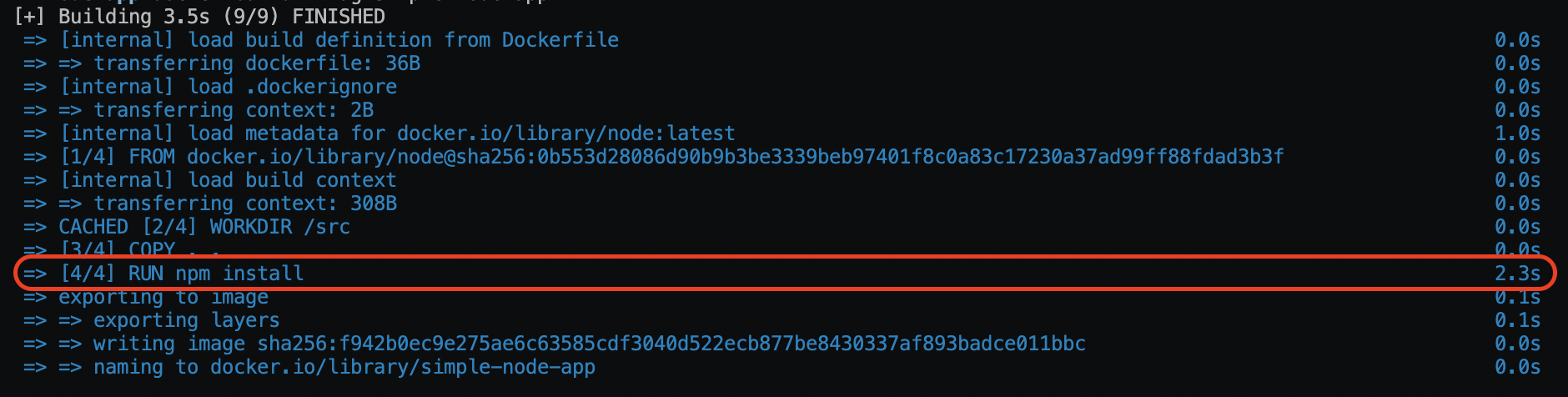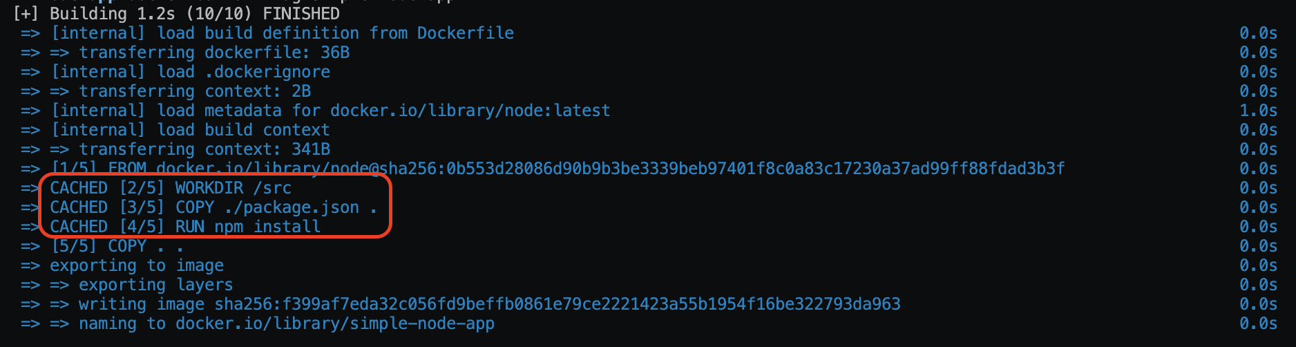보이시나요? 첫 빌드에서는 4.6초가 소요되었지만 두 번째 빌드부터는 레이어에 캐시된 의존성을 그대로 사용해 빌드 시간을 1.2초까지 절감한 모습입니다.