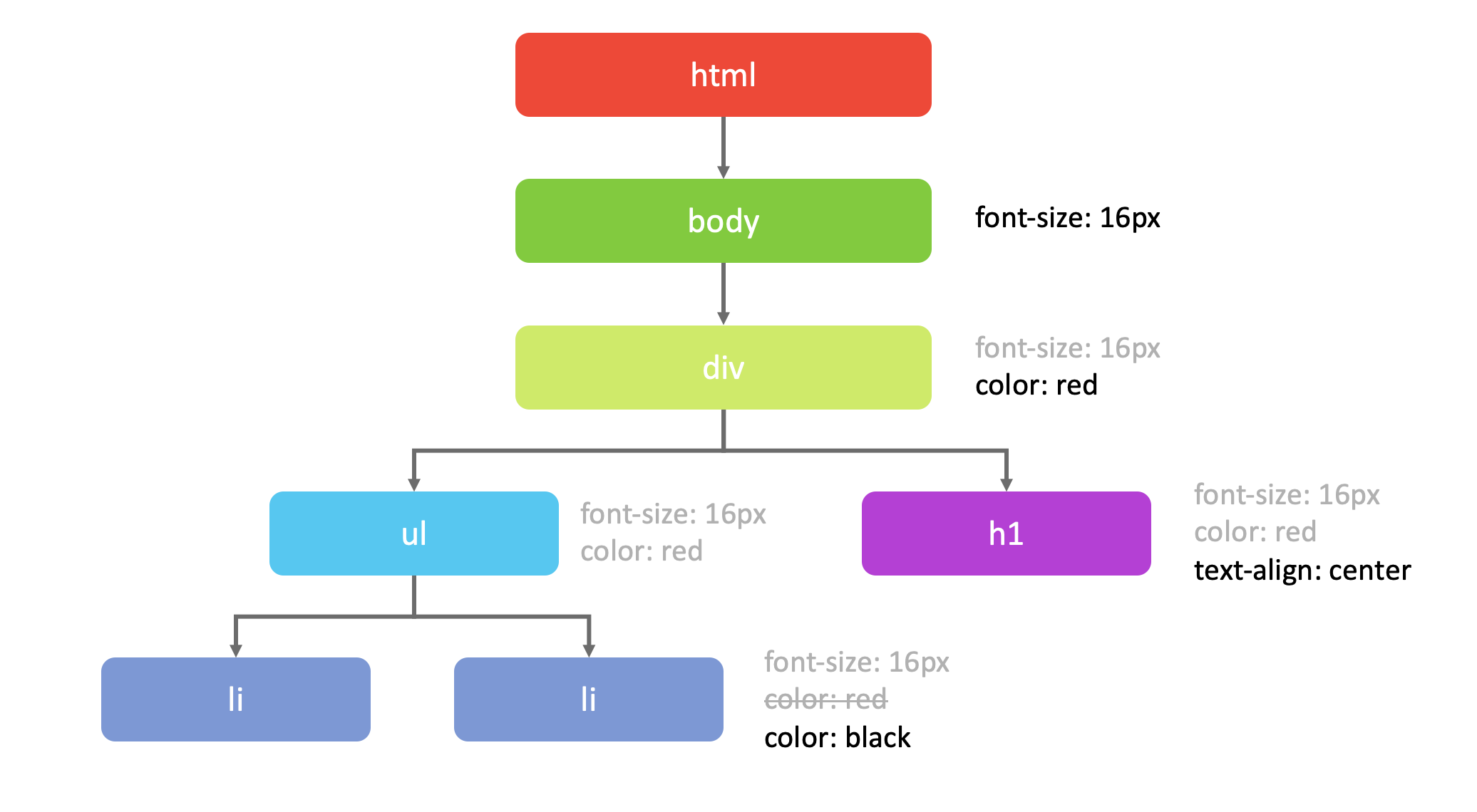 바로 상위 노드의 스타일 속성을 하위 노드들이 그대로 물려받는다는 것으로, 이렇게 위에서부터 아래로 밀려 내려온다는 점이 CSS(Cascading Style Sheet) 이라는 이름이 붙은 이유 중 하나라고 하네요. 😄