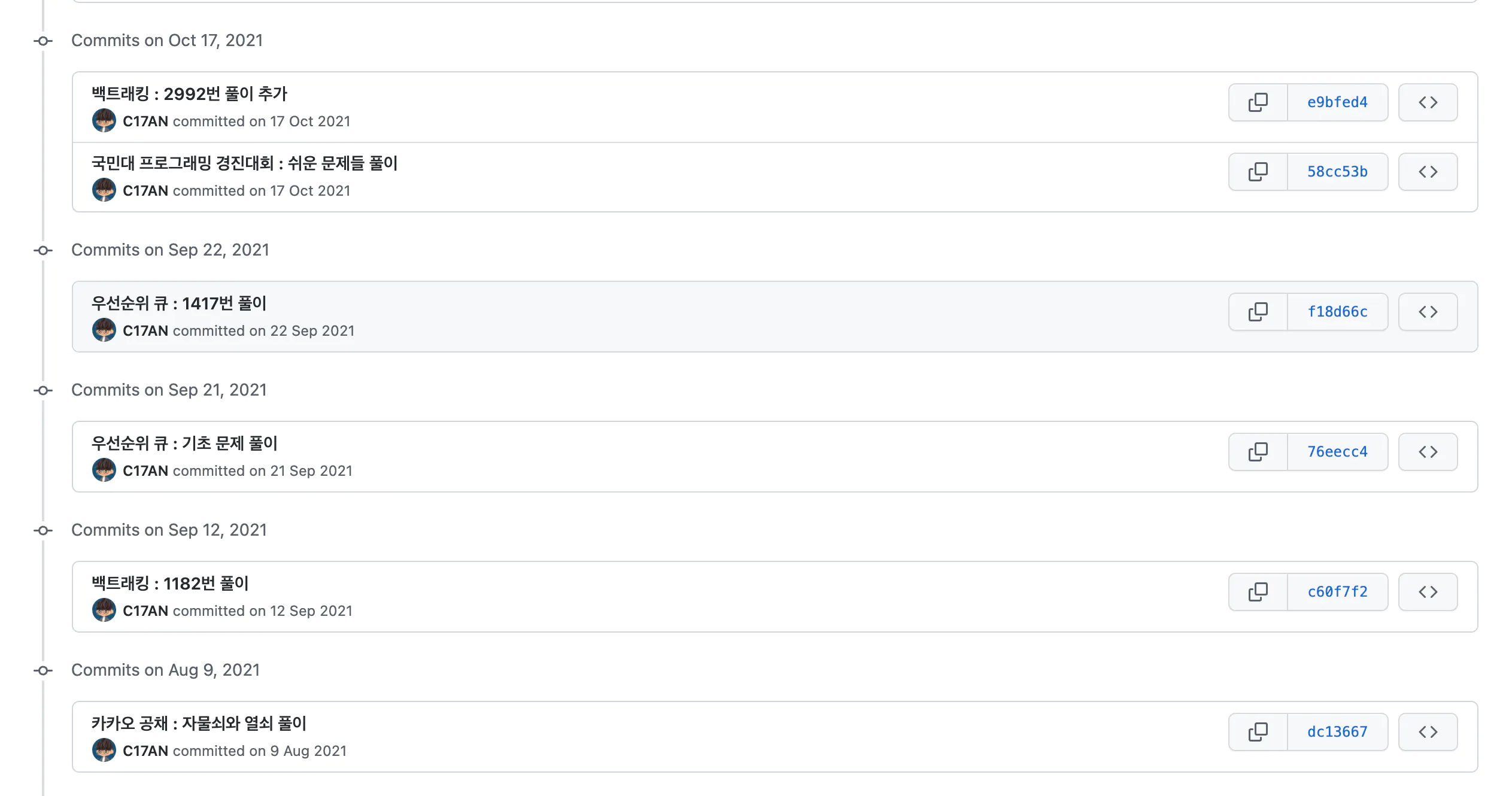 저는 알고리즘 문제를 풀이하면 그 코드를 깃허브에 업로드하곤 하는데요, 어느 날 저장소의 일관되지 않은 커밋 메시지가 신경쓰이기 시작했습니다.