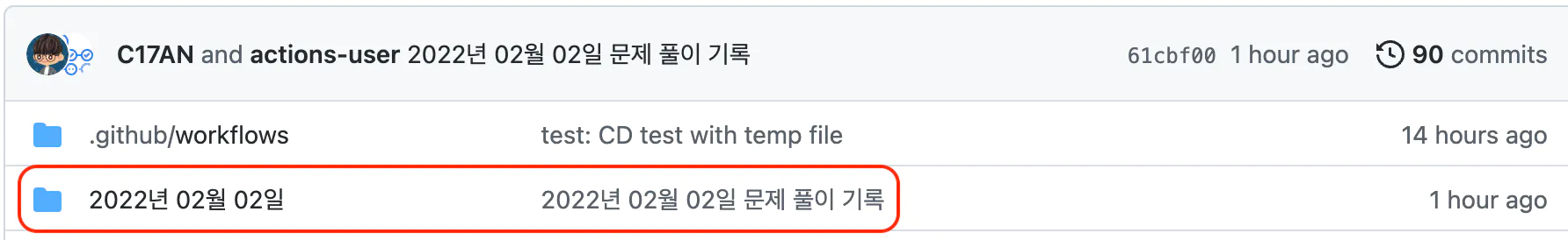 이제 루트 폴더에 오늘 해결한 문제 풀이들을 위치시키고, 커밋을 아무렇게나 남기기만 하면 자동으로 {오늘 날짜} 풀이 기록 이라는 커밋 메시지와 함께 {오늘 날짜} 폴더 안에 문제 코드들이 위치하게 됩니다.