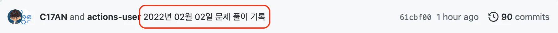 이제 커밋을 남기면 {현재 날짜} 문제풀이 기록 이라는 이름의 커밋이 새로 추가되는데요, 이를 통해 원하는 형태의 커밋 메시지를 남길 수 있게 되었습니다.