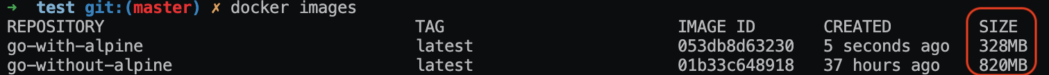 이미지를 빌드한 결과, 알파인을 사용하지 않았을 때에 비해 1%도 되지 않는 용량을 차지하는 모습입니다.