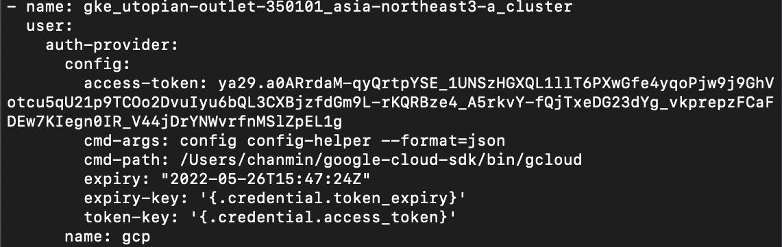 하지만 쿠버네티스 설정 파일에는 클러스터의 서버 주소 및 액세스 토큰 정보가 포함되어 있어(위 이미지) 보안성이 필요하다고 생각해 둘 중 바인드 마운트를 활용하는 방법을 택했고, 결과적으로는 잘 동작하는 것처럼 보였습니다.
