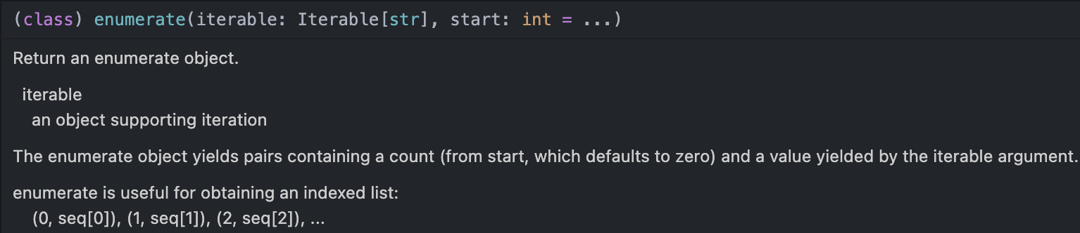 파이썬이 사랑받는 곳 중 하나인 코딩 테스트에서는 무엇보다 성능이 중요한데요, 결론부터 이야기하자면 enumerate 는 메서드가 아니기 때문에 함수의 I/O를 일으키지 않고, 이터레이션 프로토콜만을 수정하기 때문에 시간 복잡도는 O(1) 이 됩니다.