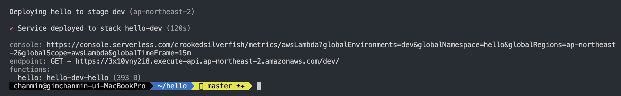 이후 약간의 시간이 지나면 serverless.yml 파일과 함께 람다 함수의 템플릿이 제공됩니다.