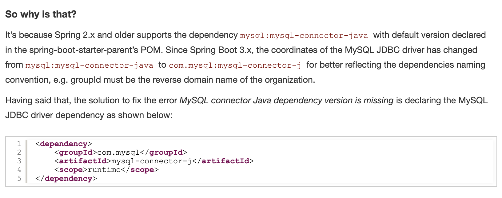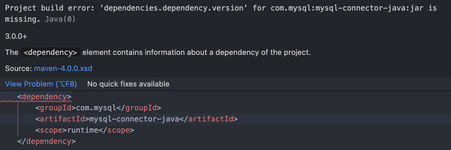 스프링 어플리케이션을 MySQL과 연결하기 위해 아래처럼 pom.xml에 의존성을 작성했는데 오류를 겪었다.