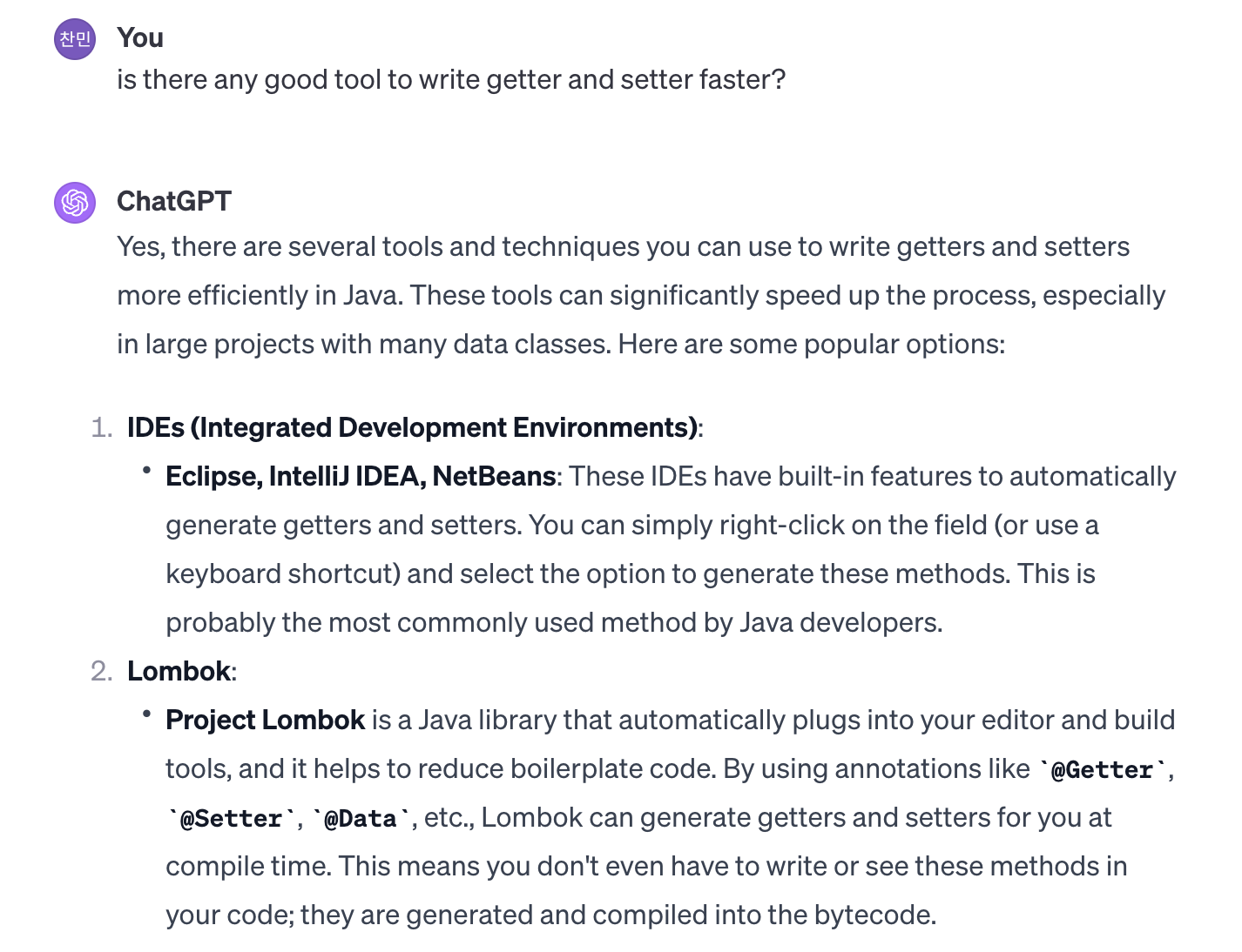 getter와 setter를 일일히 작성하는 것은 비효율적이라 생각했는데, Lombok 이라는 녀석이 도움이 될 것 같다.