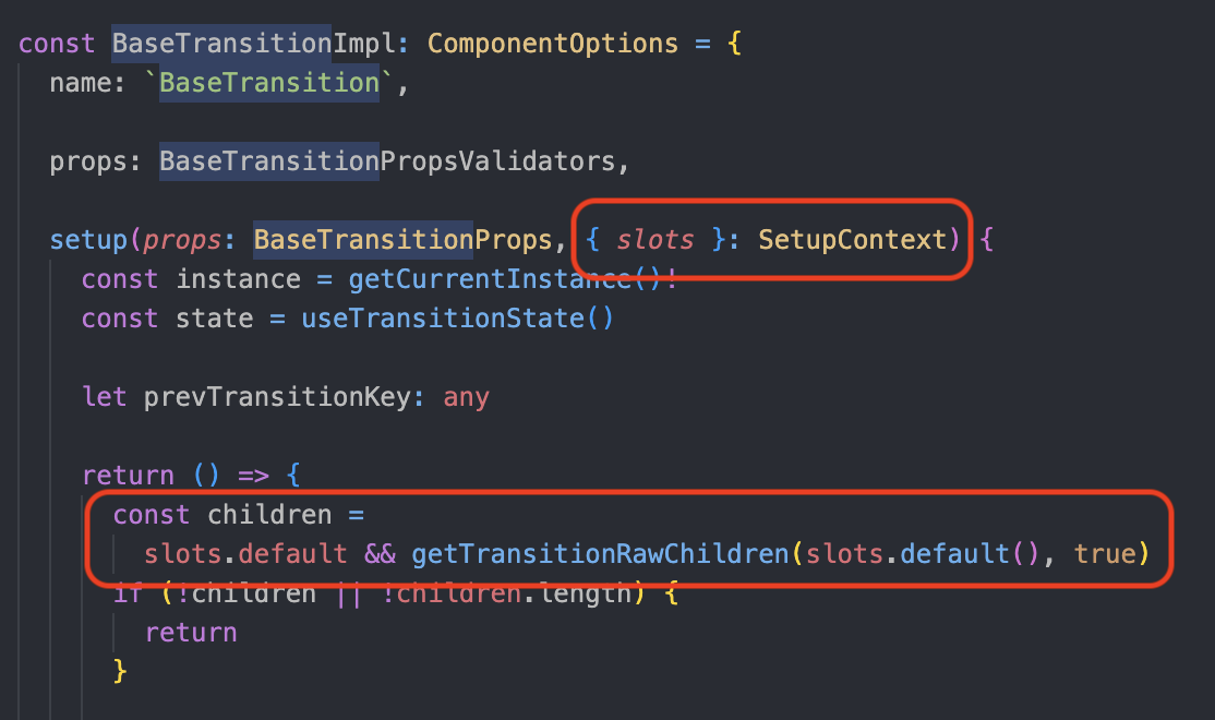 BaseTransition을 살펴보면 setup API를 활용해 stateful하게 동작하고 있는데, <router-view> 은 setup 없이 가상 DOM을 구성하는데 사용하는 VNode만을 리턴하고 있다.