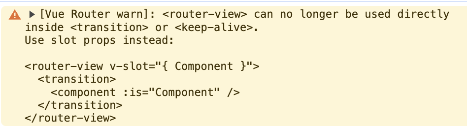 그리고 <Transition> 으로 <router-view> 를 감싸면 애니메이션이 잘 적용된 것처럼 보이나, 콘솔에 경고가 출력된다.