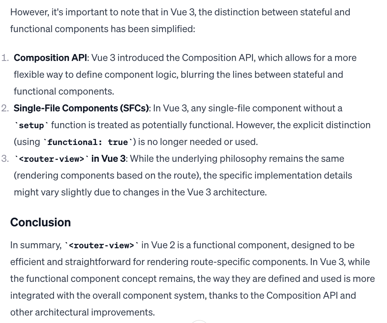 먼저 GPT의 답변은 <router-view> 는 functional component 이며 <Transition> 은 stateful component 이므로 둘의 동작이 달라 부작용이 생길 수 있다는 내용이다.