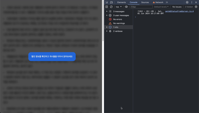 광고 페이지에 들어갔다 나오면 컨텐츠가 잘 노출되지만, 사용자가 뷰포트 바깥(Ex. 개발자 도구, URL 입력 창 등) 에 포커스를 맞췄다가 창을 누를 때마다 요청이 전송되고 있는 모습이에요.