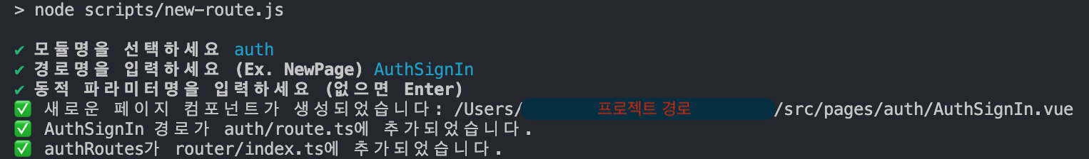 대략 다음과 같은 질의를 거치고, 선택한 모듈에 빈 페이지를 생성한 다음 해당 페이지를 라우트 목록에 등록까지 해주는 CLI다.