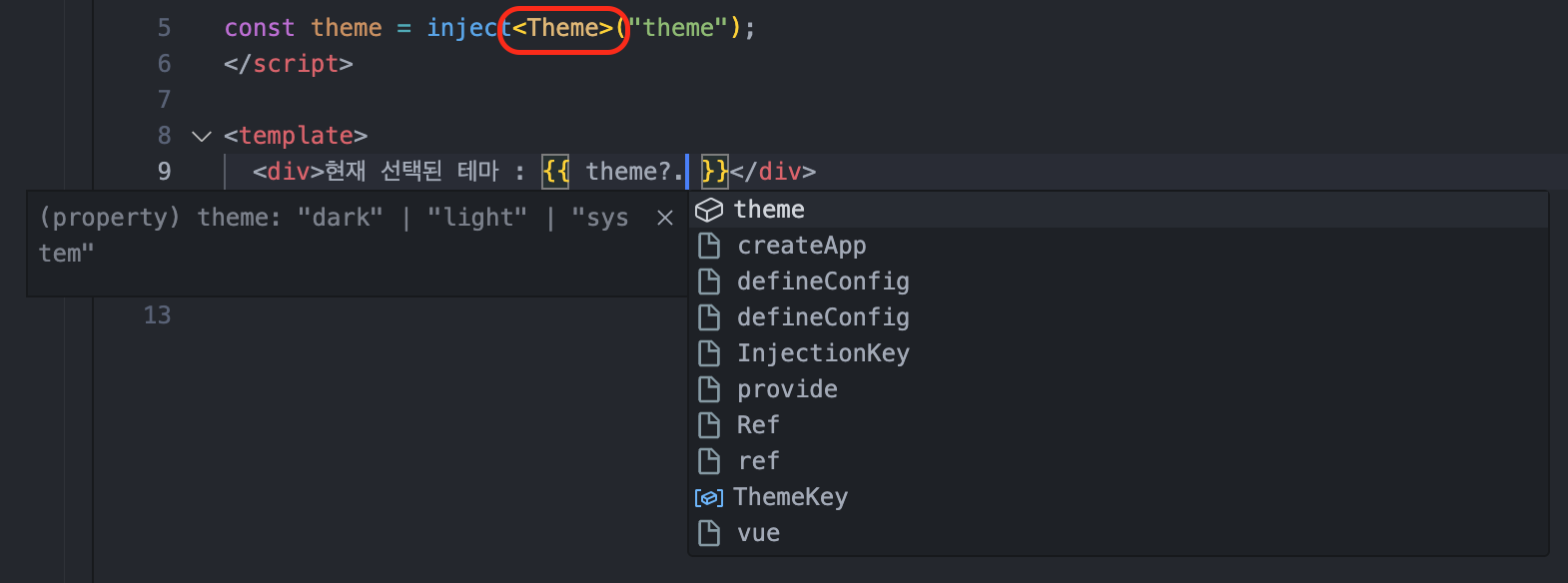 // "inject(INJECT_THEME_KEY) 로 주입한 값은 Ref<Theme> 타입이야" 라고 선언했습니다.