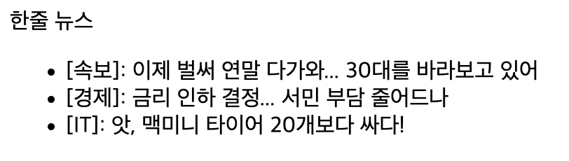 "한줄 뉴스" 라는 서비스를 구현하게 되어 DOM을 Purify한 뒤 화면에 그려준 모습입니다.