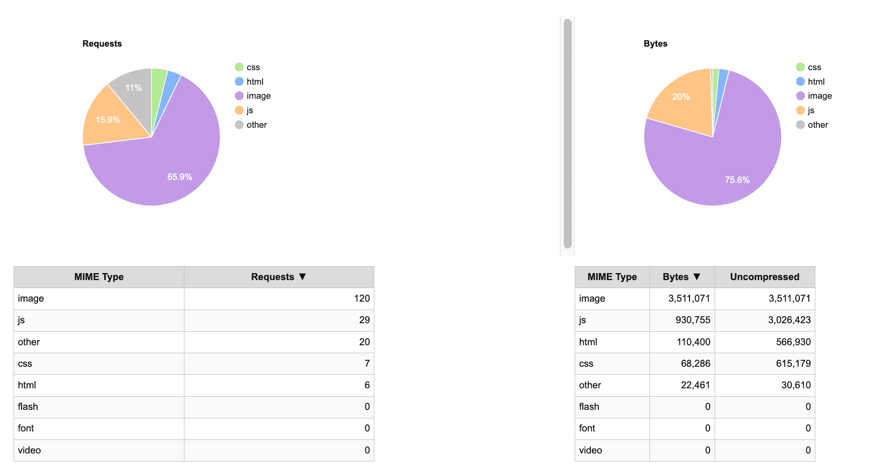 yceEffort 님의 '새로 바뀐 네이버 메인 훔쳐보기' 라는 글을 훔쳐보던 중, MIME 타입별 리소스를 요청한 횟수와 그 크기를 보여주는 차트가 눈에 들어왔다.