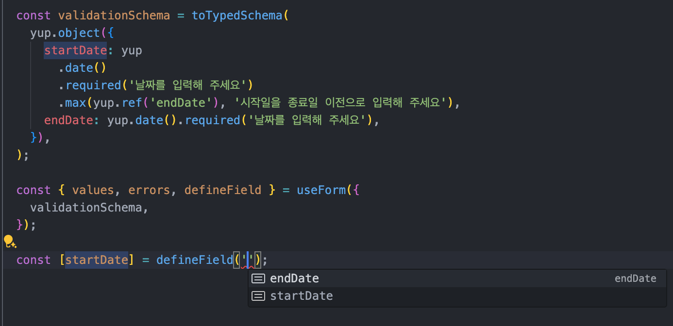 React-Hook-Form (RHF)의 register 함수와는 달리, vee-validate의 defineField 함수는 기본적으로 타입 추론을 제시하지 않는다.