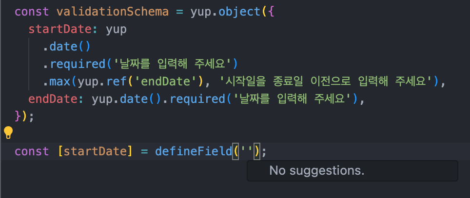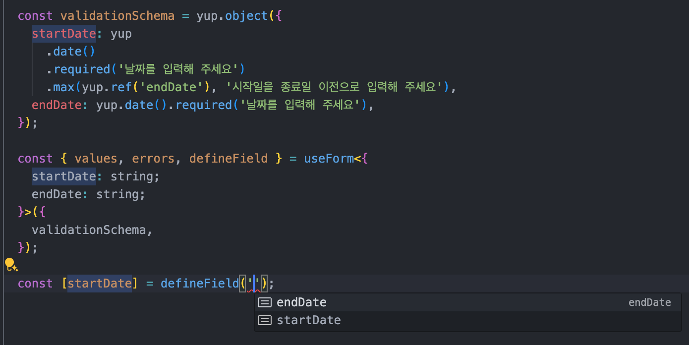 const [startDate] = defineField(''); // ✅ defineField 함수 인자의 타입이 추론된다.