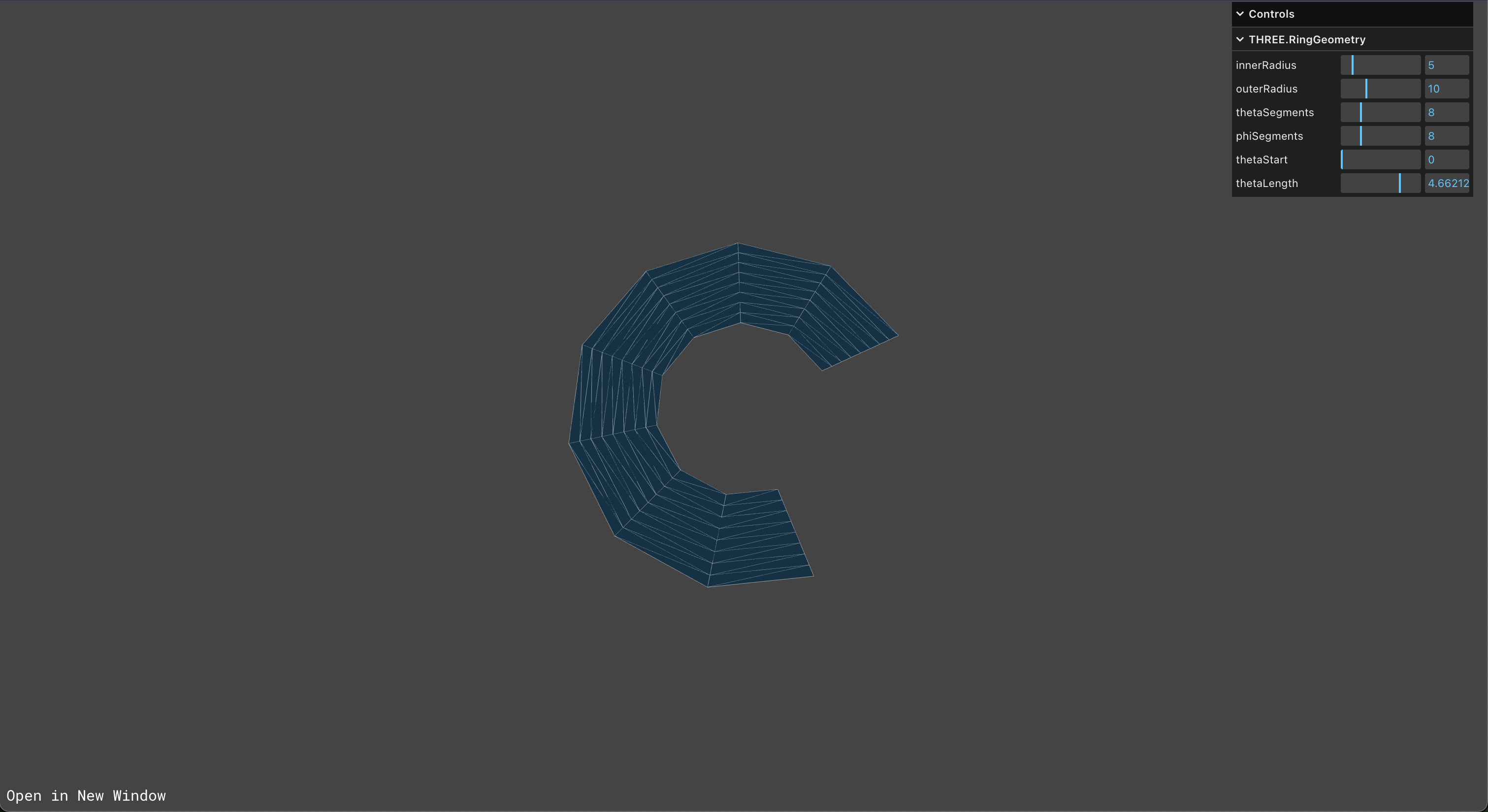 const geometry2 = new THREE.RingGeometry(7, 6.7, 100, 1, 0, 4);