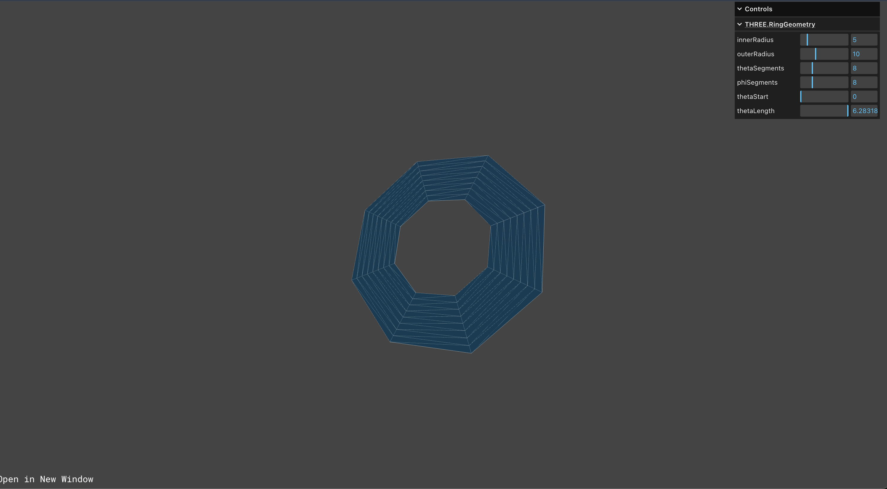 const geometry3 = new THREE.RingGeometry(7, 6.7, 100, 1, 4, 4);