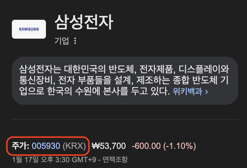 (만약 국내 티커의 단축번호를 모르겠다면 구글, investing 등에서 간단히 알아낼 수 있다.)