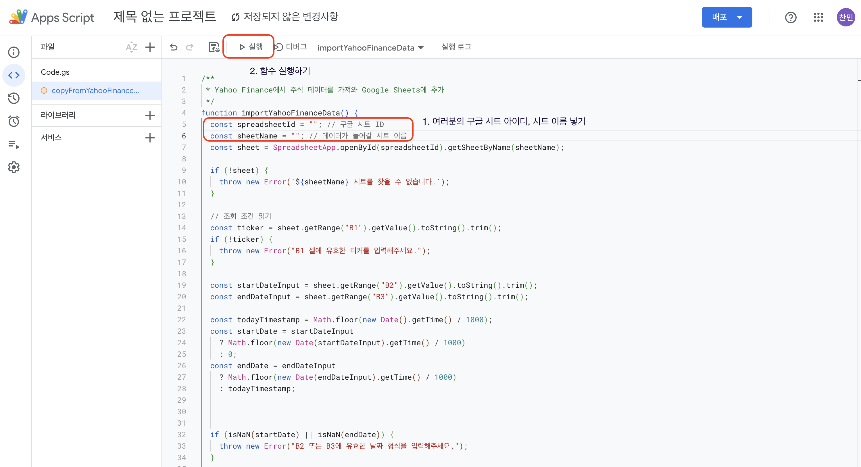 위의 코드를 통으로 복사한 뒤 바로 실행하지 말고, 시트 아이디와 이름을 입력하는 과정을 꼭 기억하자.