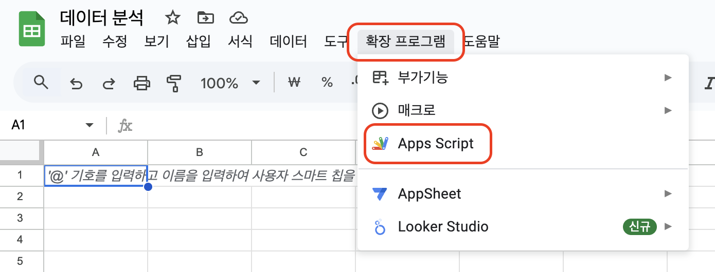Apps Script는 구글 워크스페이스 (캘린더, 독스, 스프레드시트, 슬라이드 등) 제품군을 프로그래밍을 통해 제어하는 기능인데, 스크래핑 로직 구현을 위해 구글 시트에서 [확장 프로그램] - [Apps Script] 메뉴를 찾아보자.
