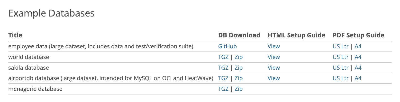 다만 내가 언제 테스트용 데이터베이스를 또 만들어야 할지 모르는데, 누군가가 만든 프로시저를 필요할 때마다 찾아 쓰는건 좋은 방법이 아닌 것 같아 공식 채널의 best practice를 찾고 싶었던 중, MySQL 공식 예제 샘플 데이터베이스가 있음을 알게 되었다.