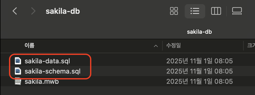 내려받은 Sakila 데이터베이스 파일의 압축을 해제하면 스키마와 데이터를 얻을 수 있다.