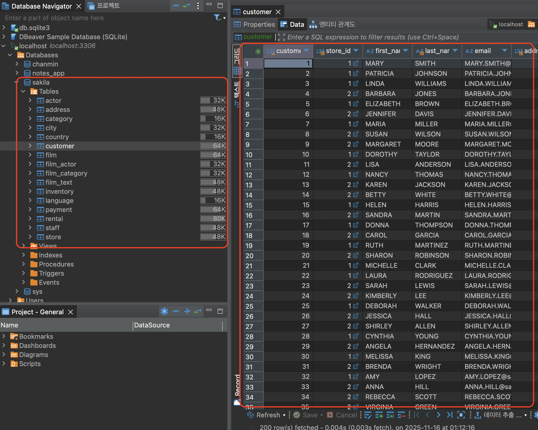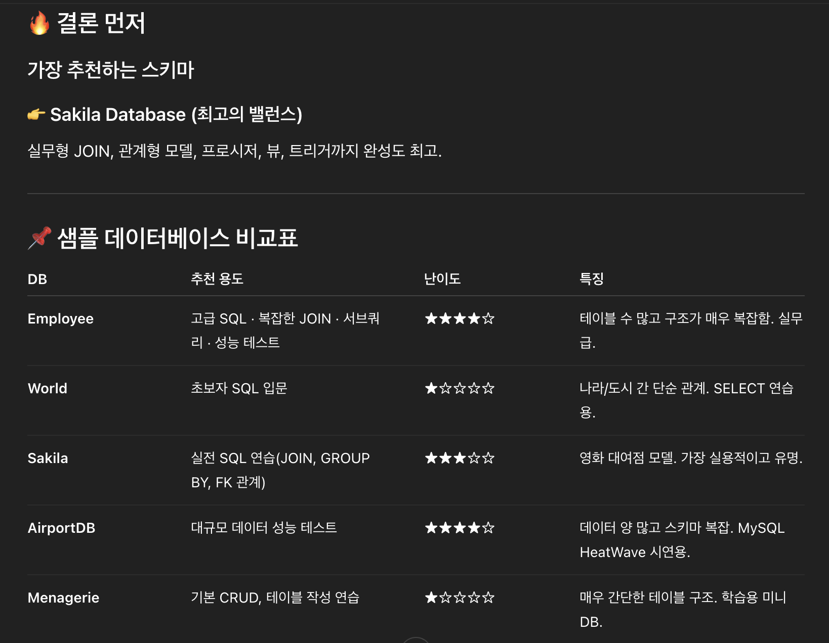 샘플 데이터베이스가 여럿 있었지만 GPT의 조언대로 Sakila 라는 데이터베이스를 사용하기로 했다.