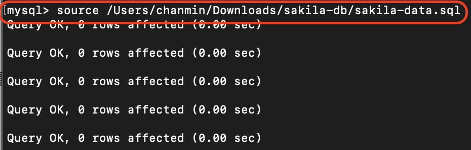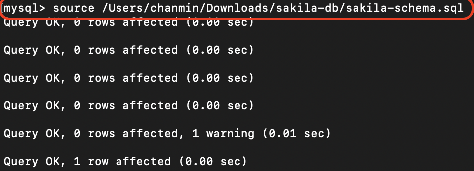 이후 MySQL 콘솔을 실행하고 압축을 해제한 Sakila 스키마와 데이터의 SQL을 실행한다.