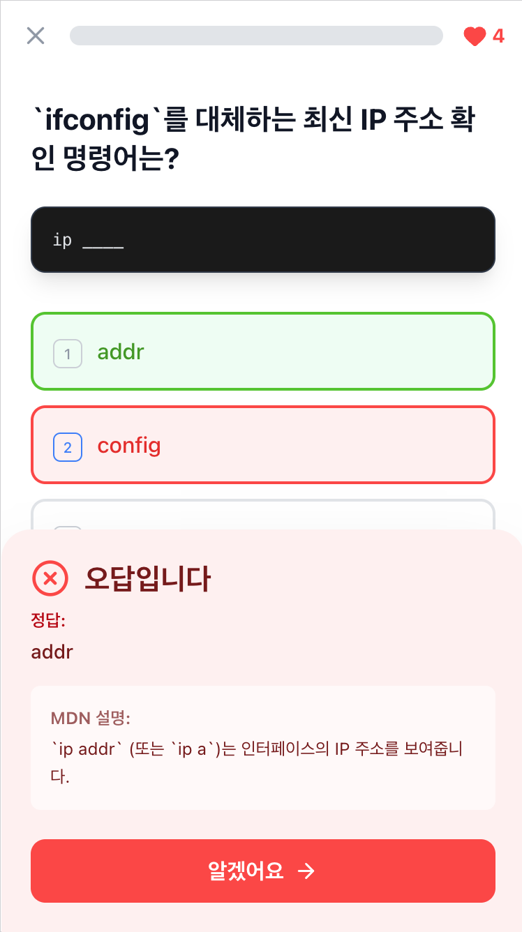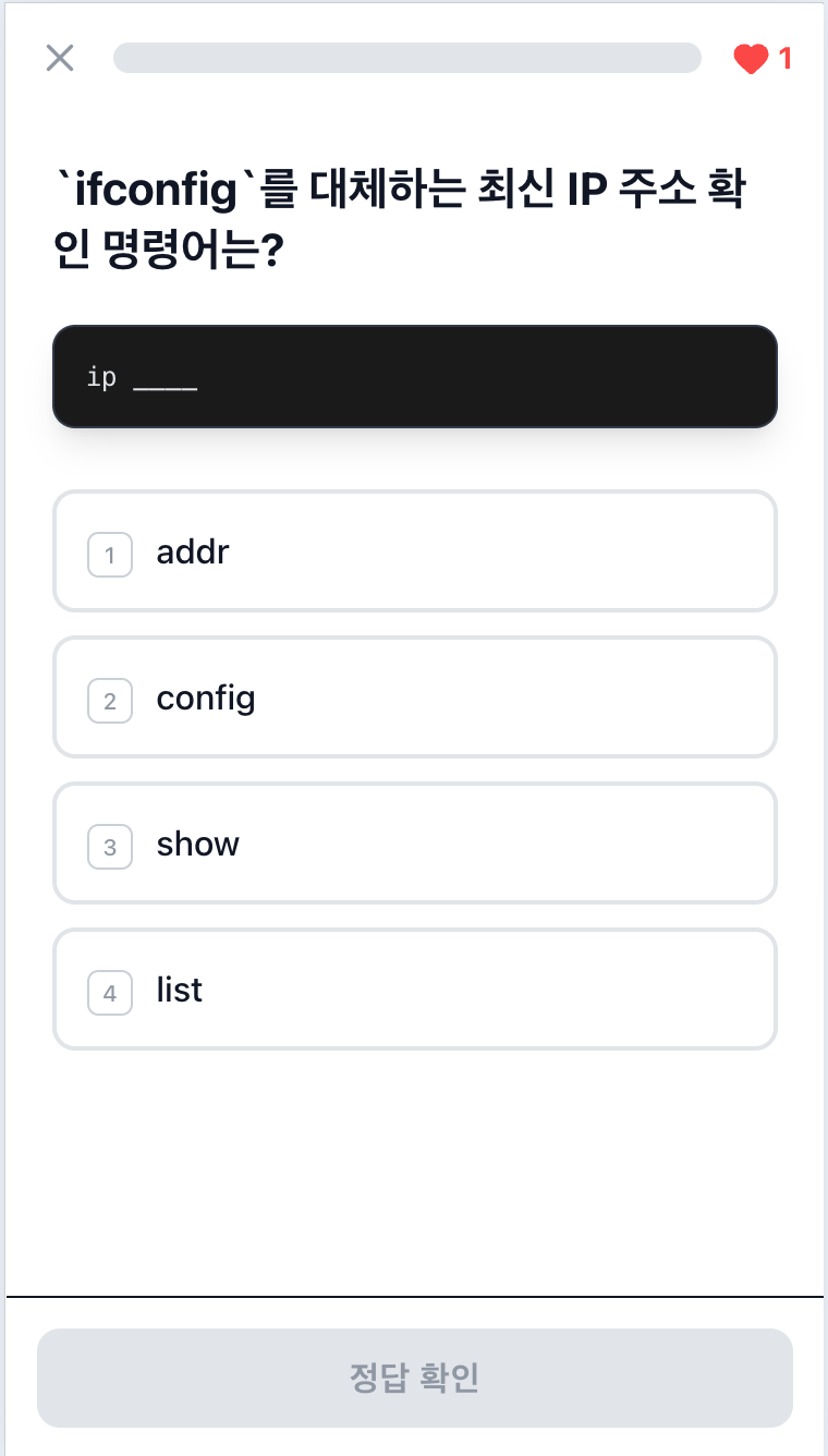 그래서 최소한 리눅스 기본기를 익히는 데에 도움을 줄 수 있도록, 즐겨 하는 듀오링고와 비슷한 UI와 문제 세트를 구성해 선물해줬다.