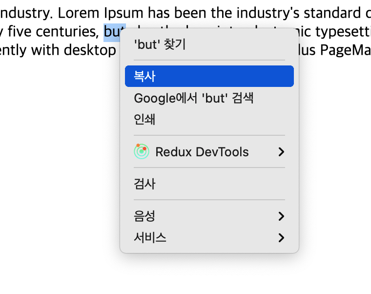 keydown 이벤트를 활용하면 컨트롤 키를 비롯한 모든 키의 입력을 감지할 수 있는데요, 위처럼 control(맥에서는 command) 키와 c 키를 같이 누르면 복사가 수행됩니다.