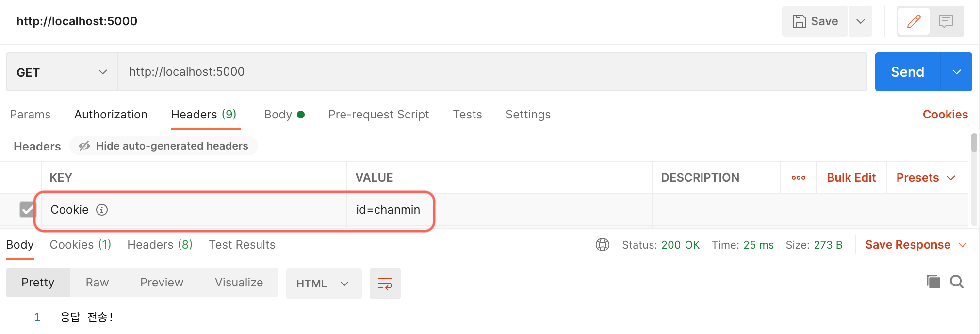 5000번 포트에 간단한 서버를 구축하고 요청이 들어오면 id=chanmin 이라는 쿠키를 전달해 보겠습니다.