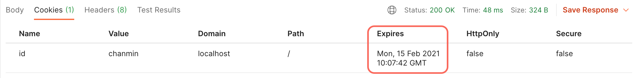 쿠키의 수명을 10초로 설정했었는데요, 약 13초가 지난 후 다시 요청을 보내보니 쿠키 객체가 null 이 된 것을 확인할 수 있었습니다.