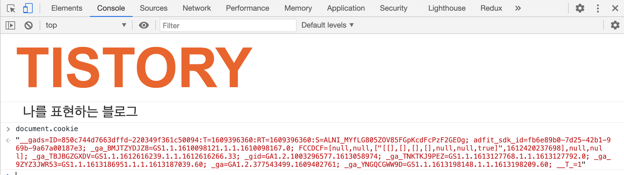 쿠키는 주로 세션 관리나 트래킹 등 용도로 사용되는데요, 트래킹의 예시로 현재 창에서 개발자 도구를 열고 document.cookie 를 입력해 보면 카카오 애드핏과 구글 애널리틱스 등 트래킹 도구에서 여러분의 접속 정보를 저장하고 있는 것을 확인할 수 있습니다.