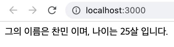 <div className="App">{`그의 이름은 ${name} 이며, 나이는 ${age}살 입니다.`}</div>