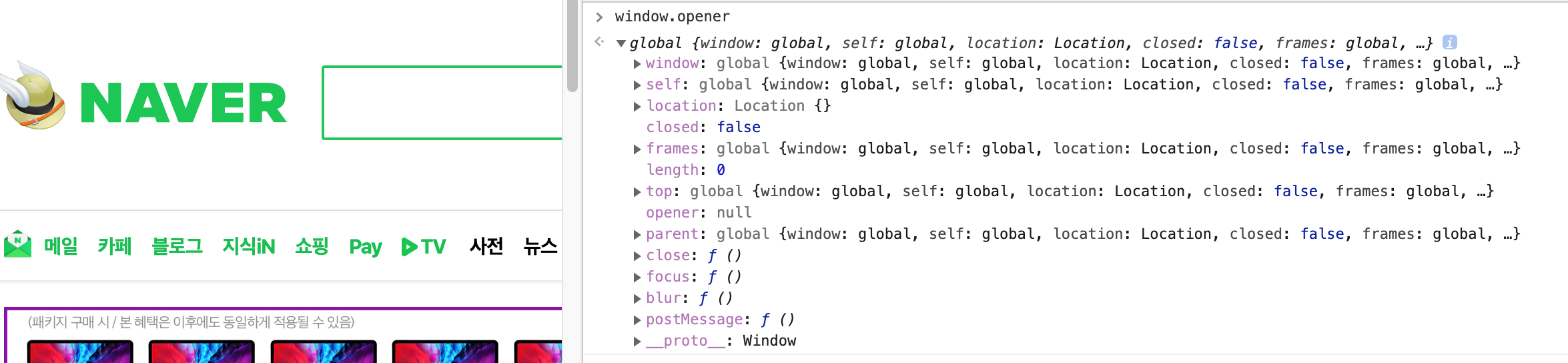 _blank 속성으로 새 탭에서 네이버에 들어간 뒤, 네이버에서 window.opener.location 속성을 조작해 이전 탭을 피싱 사이트로 바꿔치기한 모습입니다.